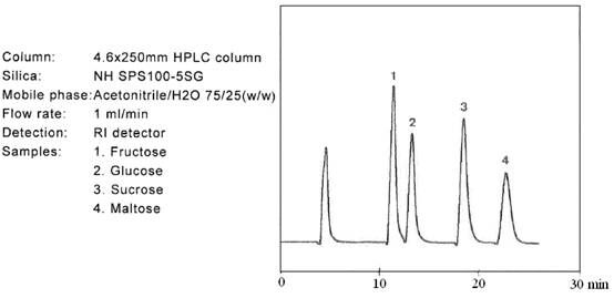 眾所周知,NH官能團(tuán)會(huì)和酮或者羧基發(fā)生反應(yīng)。但是,NH SG硅膠填料可以在有機(jī)相/水的流動(dòng)相體積下分離大多數(shù)的糖類化合物,而不發(fā)生上述化學(xué)反應(yīng)。NH SG硅膠在正相條件下使用,尤其是親水相互作用模式(HILIC)。作為典型的HILIC模式,在增加水相比例的條件下,洗脫增強(qiáng)。以下的分離應(yīng)用數(shù)據(jù),使用的就是乙腈/水體系。