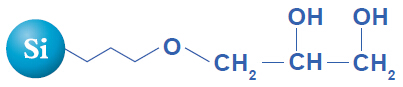 二元醇基鍵合色譜柱在正相條件下,較硅膠色譜柱,能夠更好地識(shí)別化合物的親水性差異。利用這個(gè)特性的效應(yīng),實(shí)現(xiàn)了親水性差異較小的化合物的相互分離。并且,通過(guò)均一的二元醇基處理,防止了硅烷醇基的影響所造成的水的非特異性吸附,因此,可使用水100 %洗脫液進(jìn)行清洗。可輕松地清洗吸附在填料上的高極性化合物,長(zhǎng)期使用色譜柱。并且,較硅膠色譜柱,樣品負(fù)荷量大,最適于制備HPLC。
